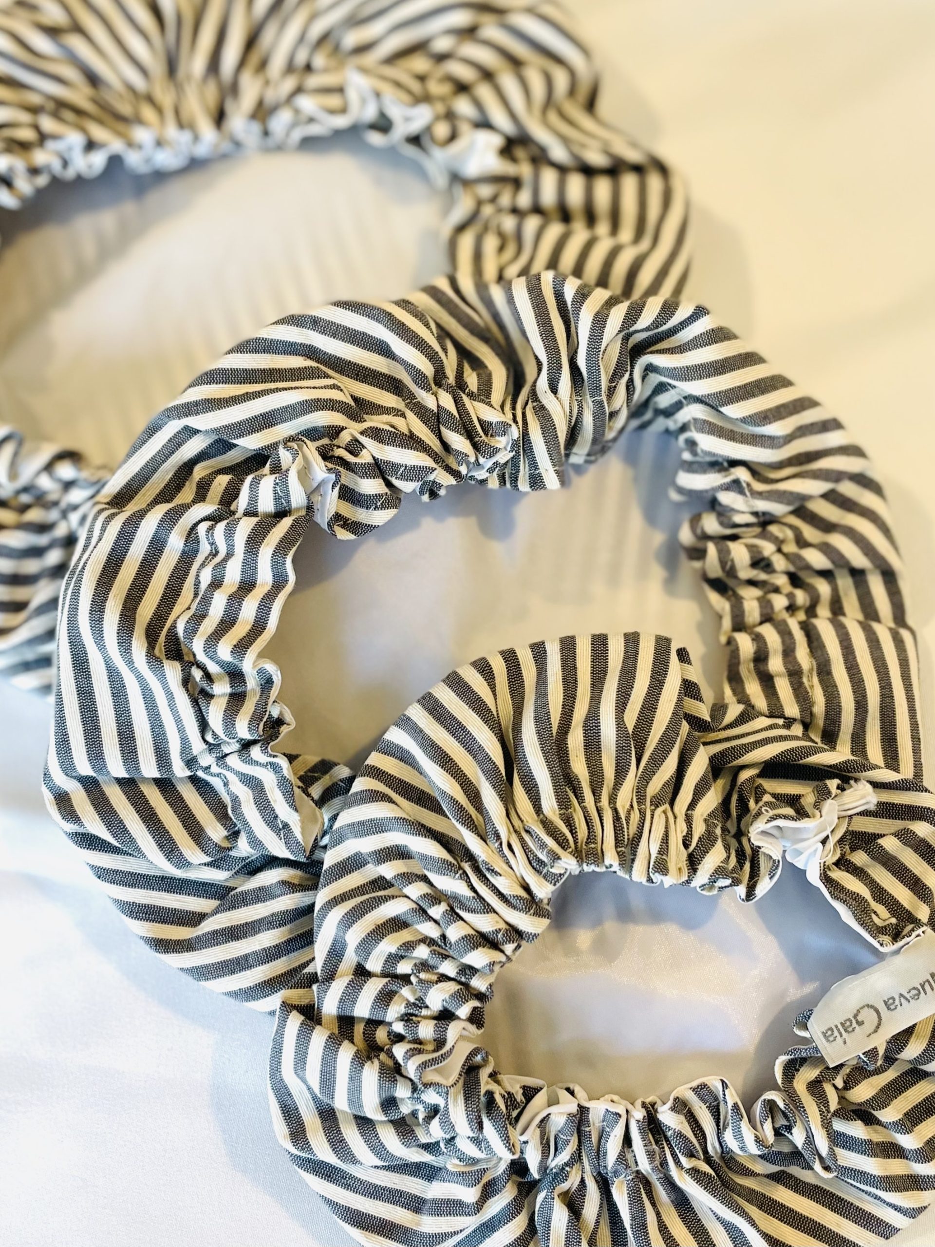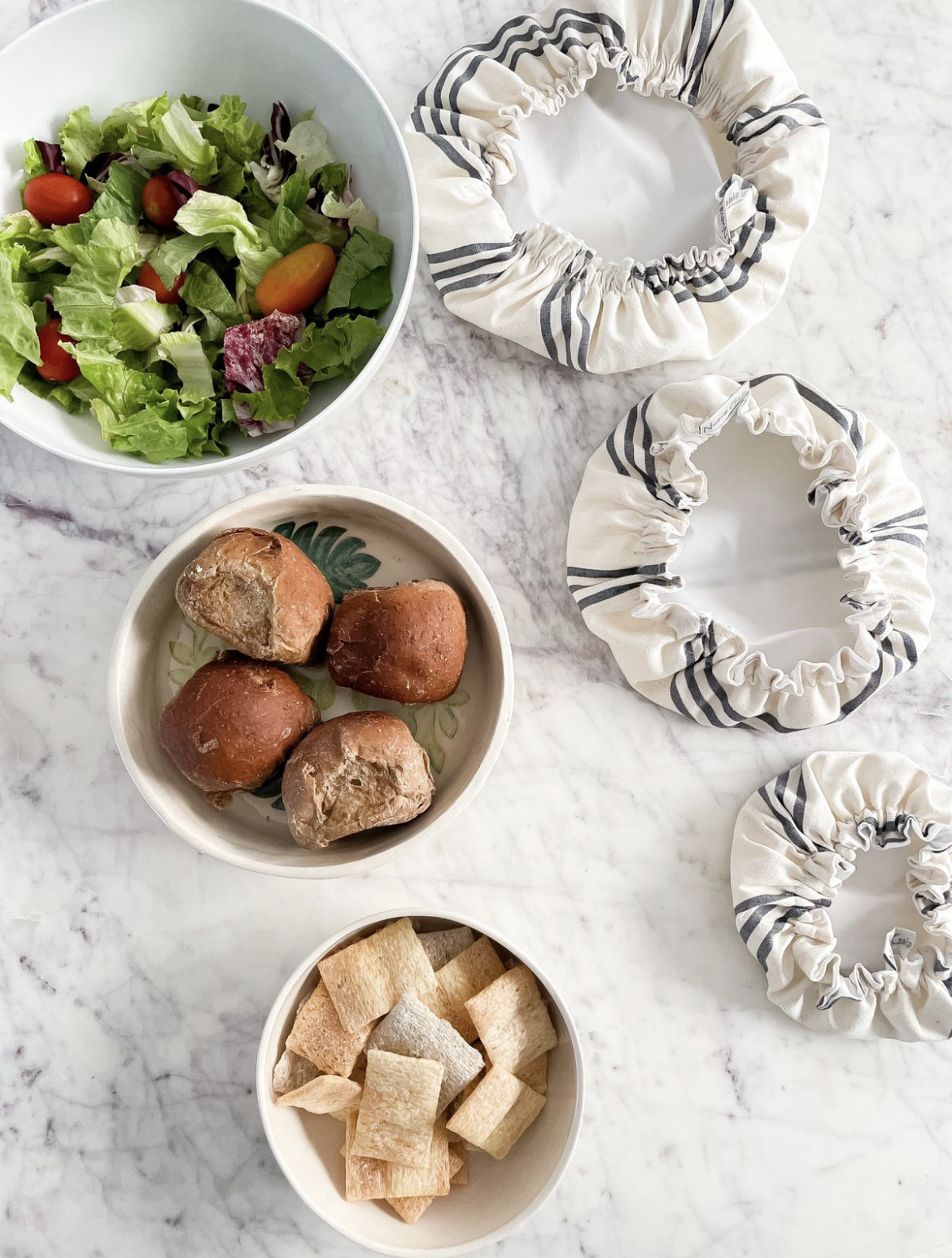 cubre ensaladera de tela estampada con elástico que ajusta los recipientes, en su interior esta forrada por una tela impermeable que permite que los alimentos no se humedezcan, son aptos para lavar en lavarropa, no se recomiendan ponerlos en el secarropas