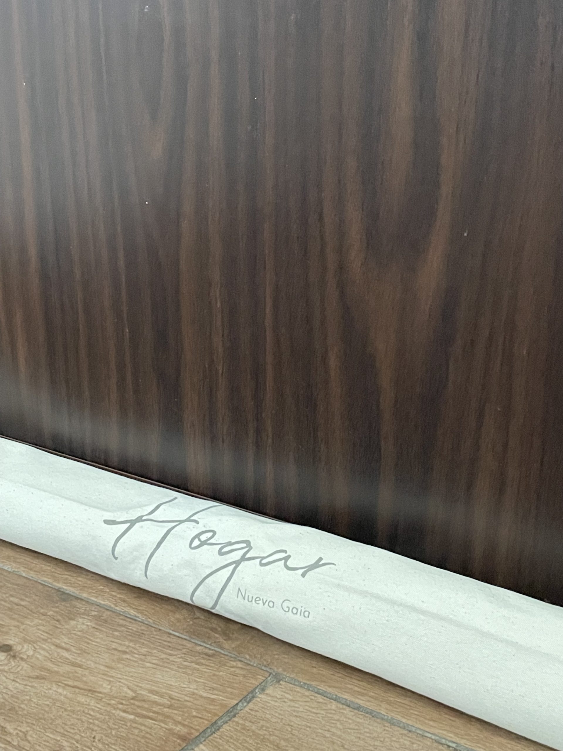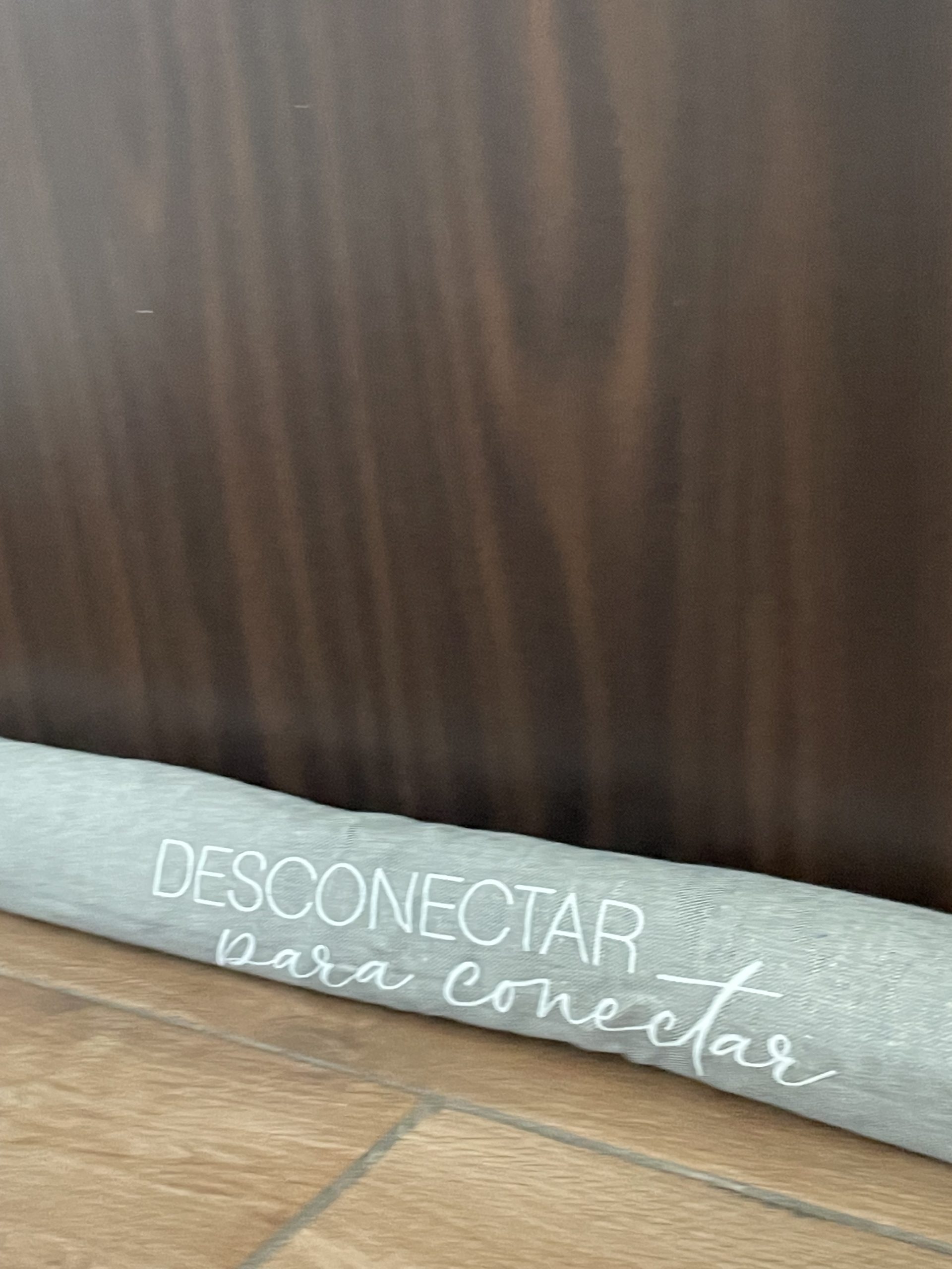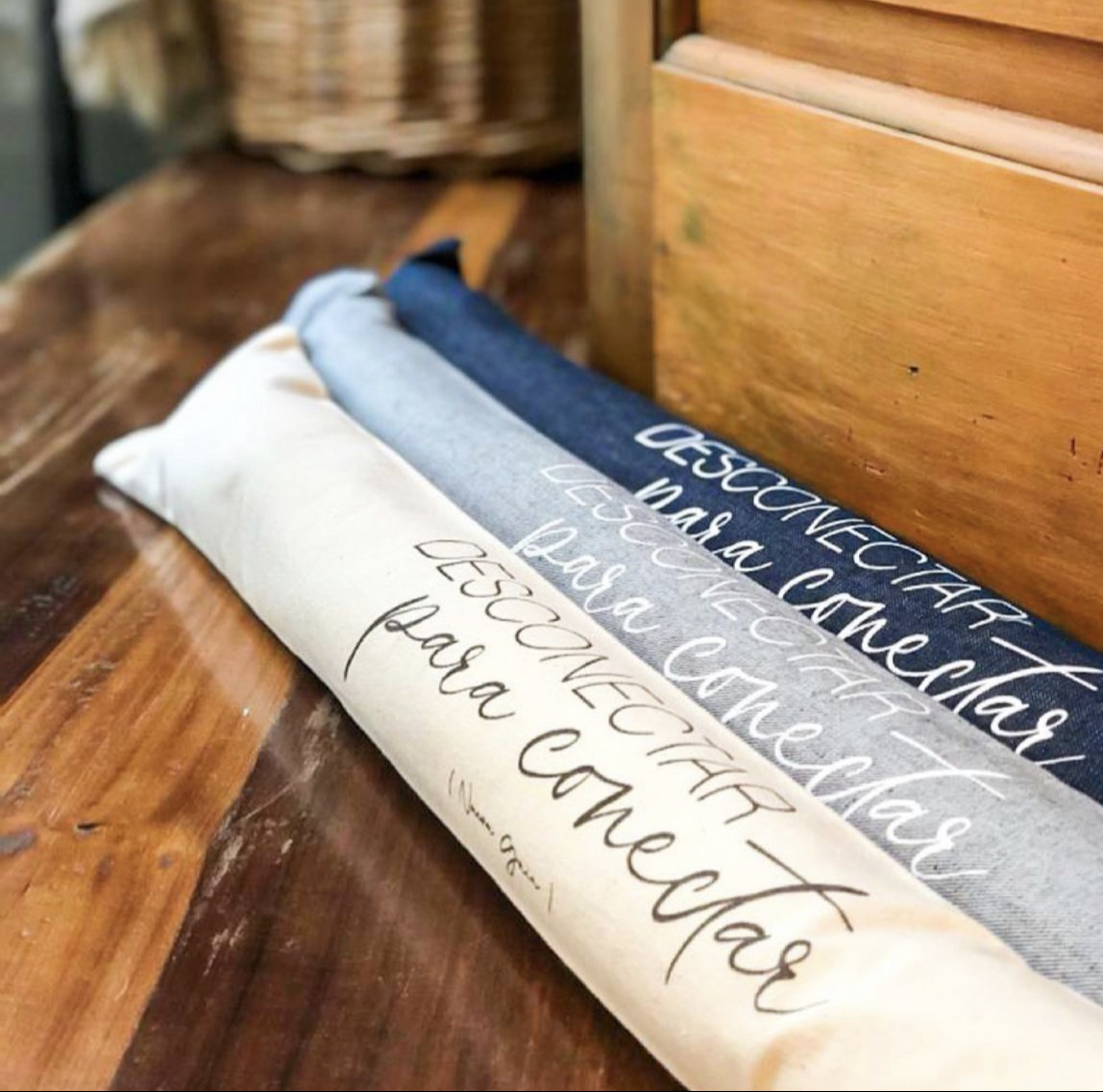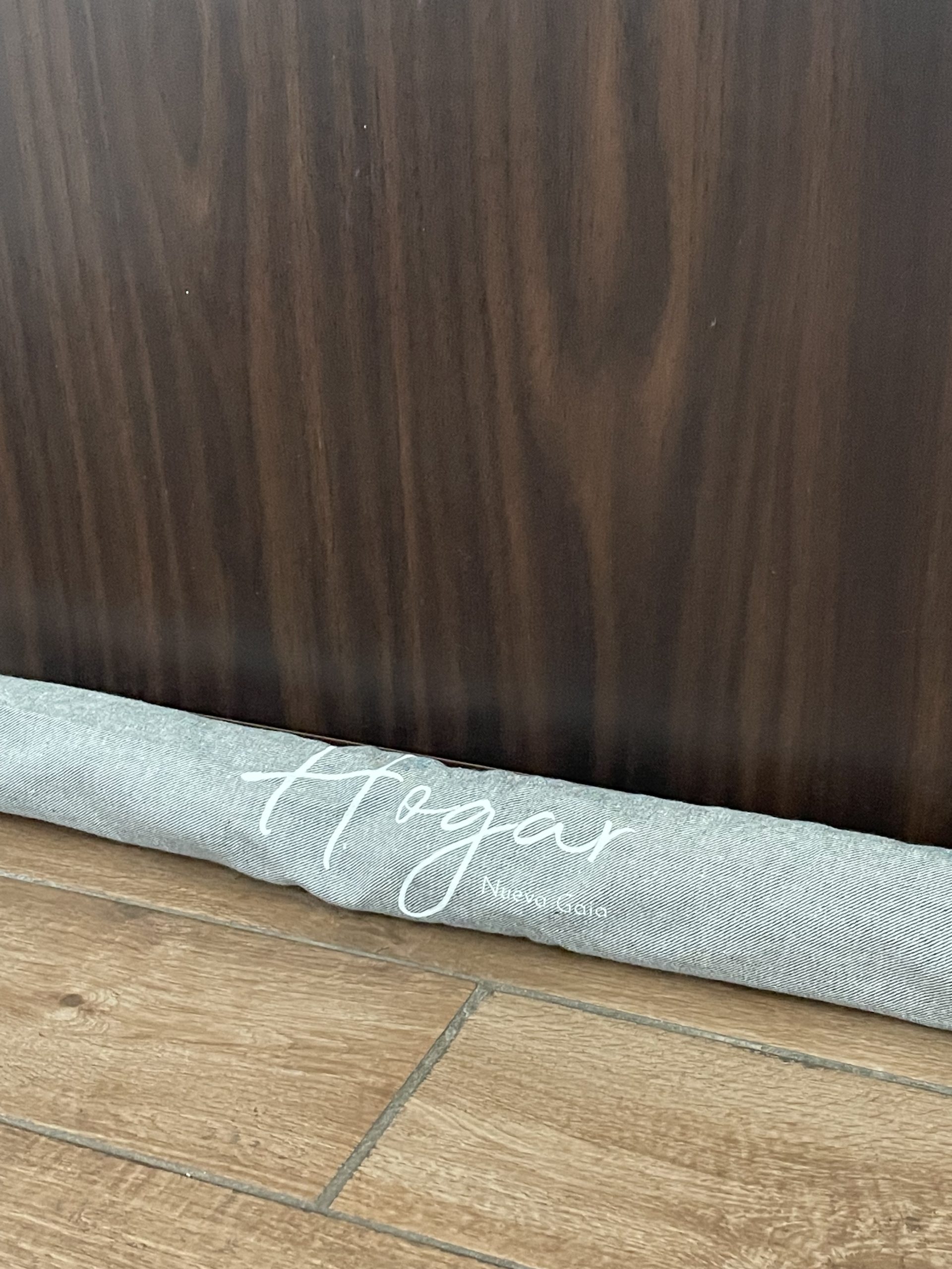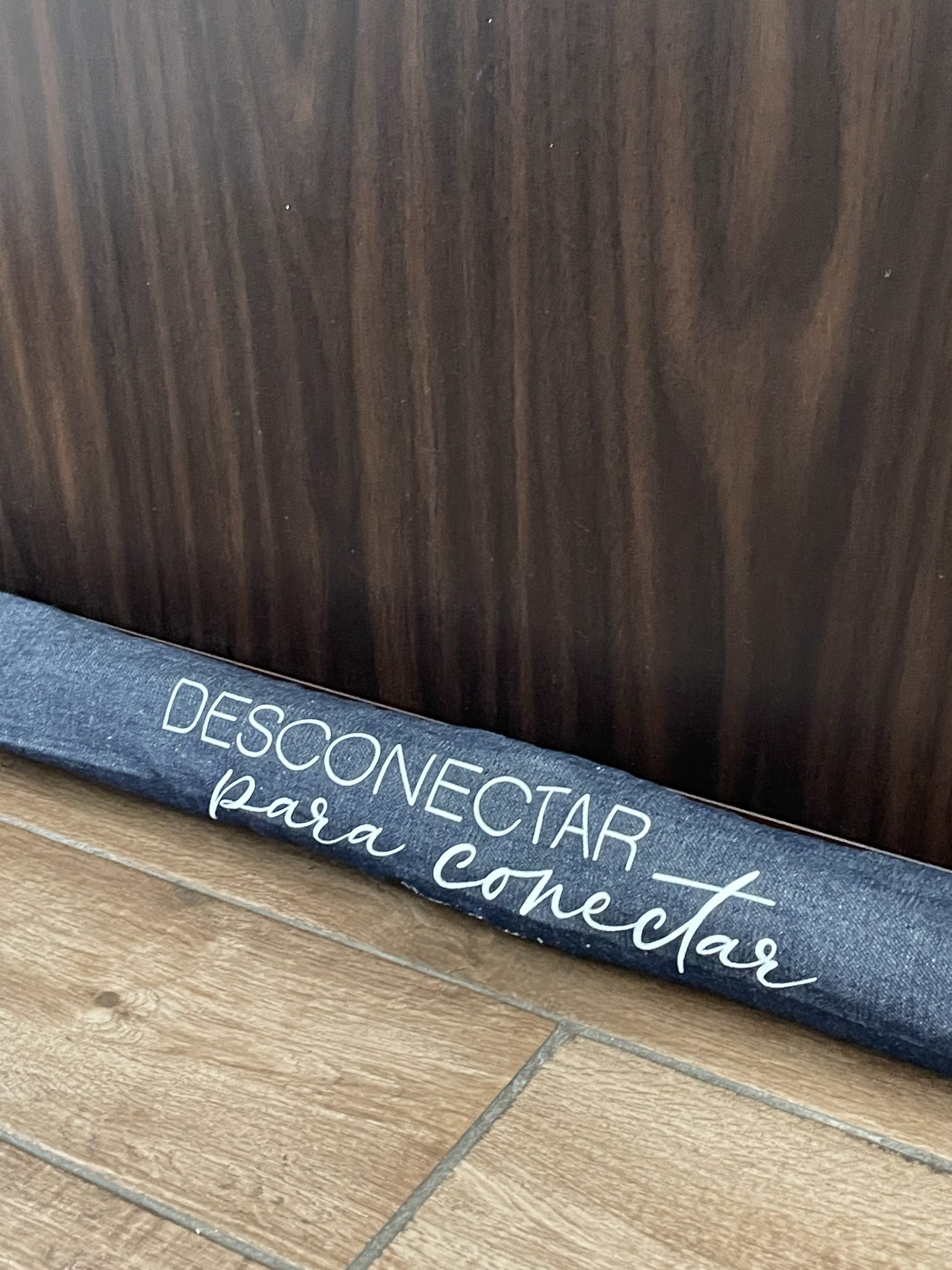Burlete para Puerta de jeans o Lona con frase impresa , medida de 90 x 10 completo con relleno de forma tubular, con abrojo en el extremo para que no se escape la bolsa con relleno